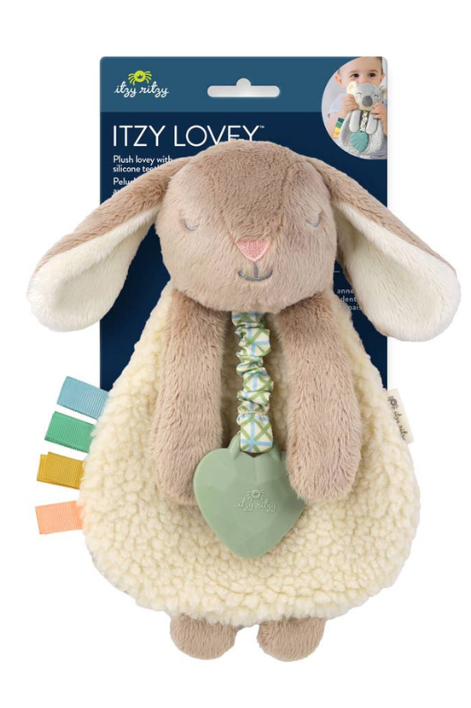 Meet Billie the Bunny, named after the real Itzy Ritzy team's own little ones! Our snuggly Itzy Lovey™ features soft sherpa fabric and textured ribbons that baby will love to explore! A textured silicone teether helps massage and soothe sore gums, and crinkly arms are sure to keep baby entertained with their gentle sound! For ages 0m+.