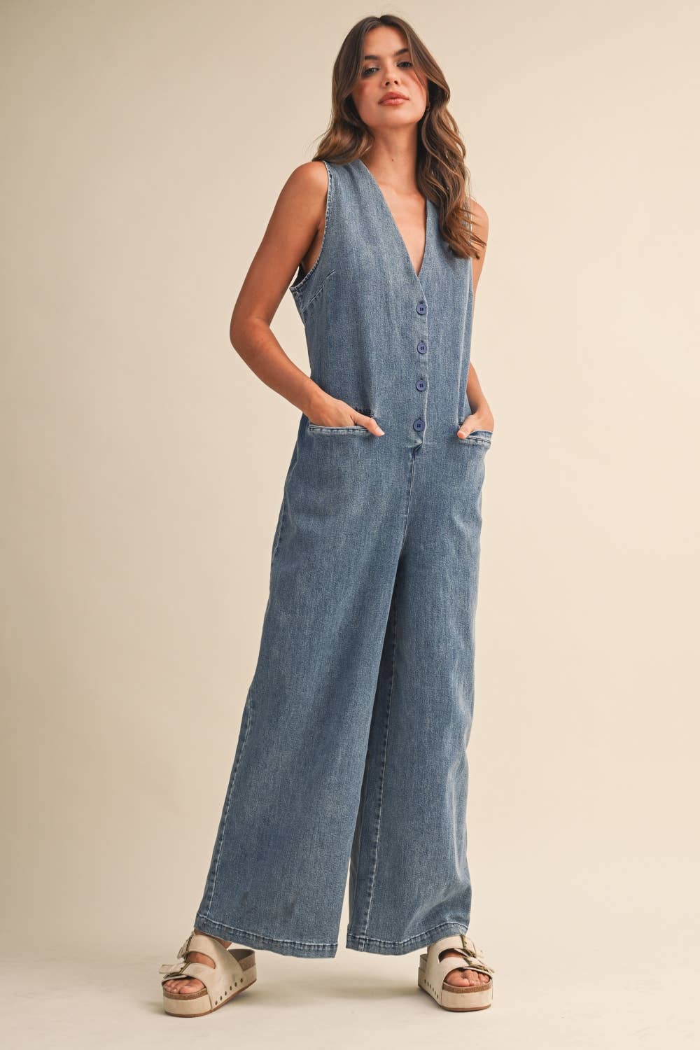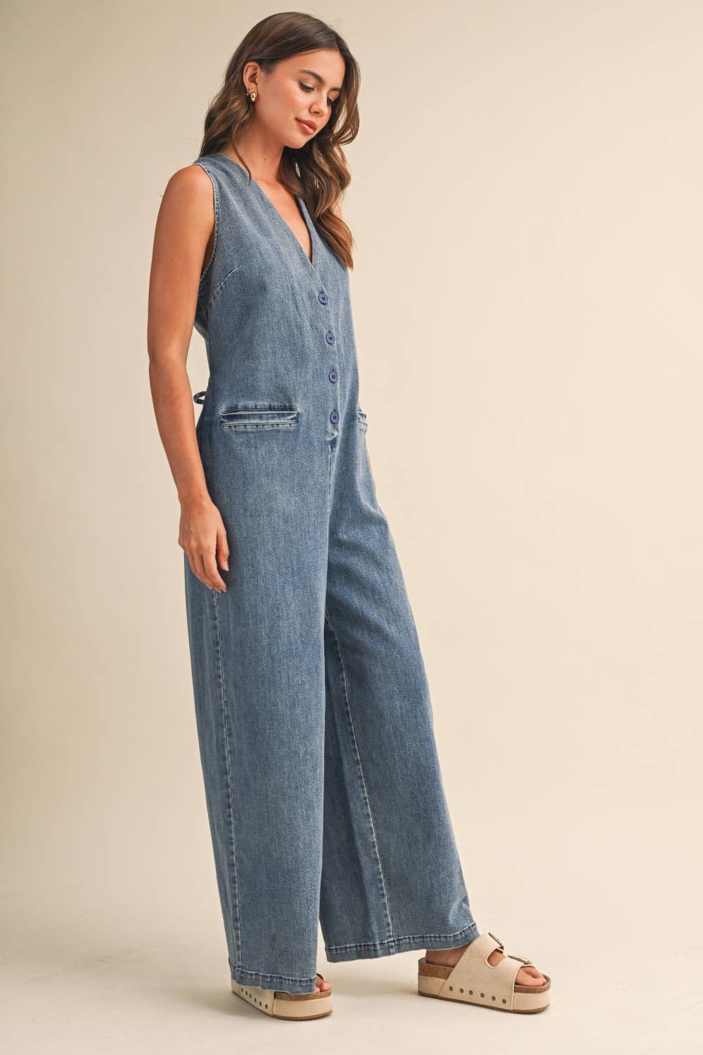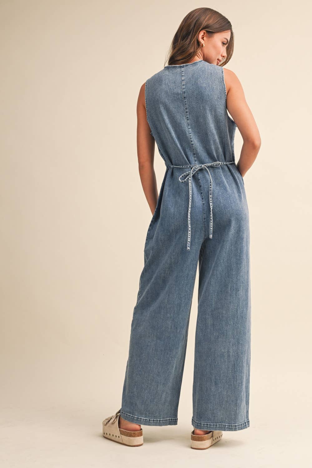 Denim sleeveless jumpsuit with adjustable back tie. Loose fitting and wide leg for a comfortable yet stylish outfit.