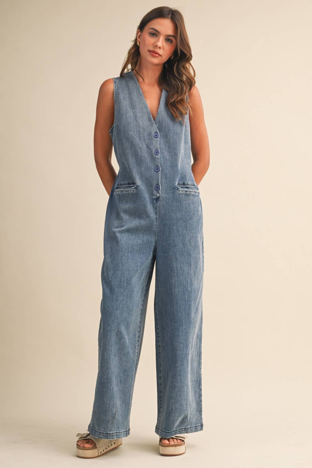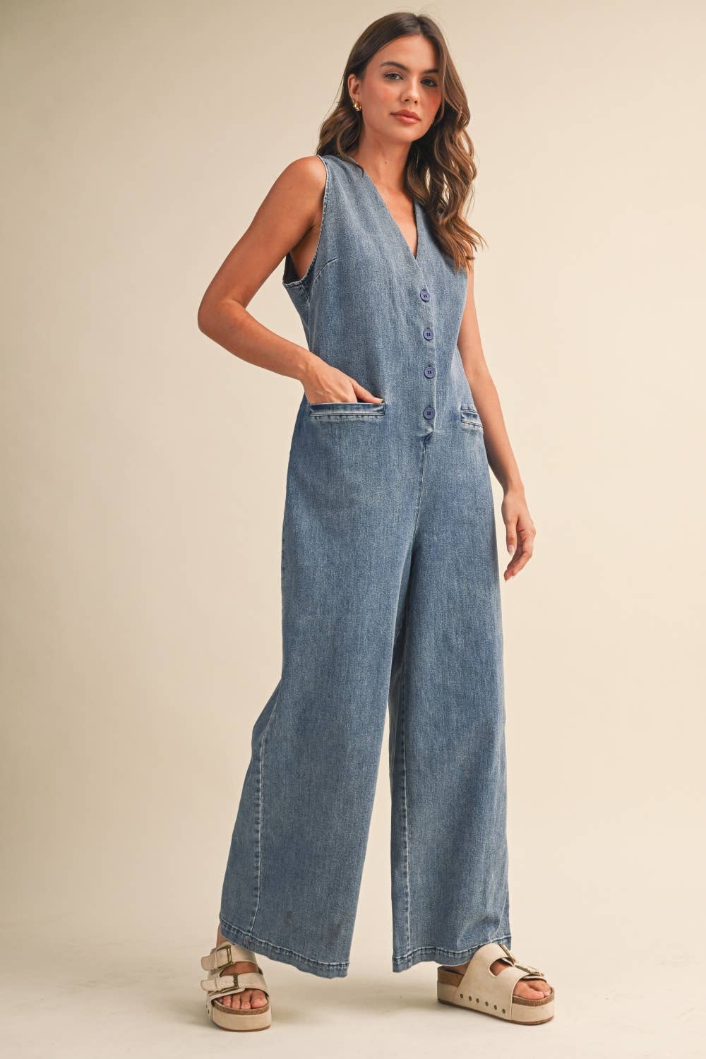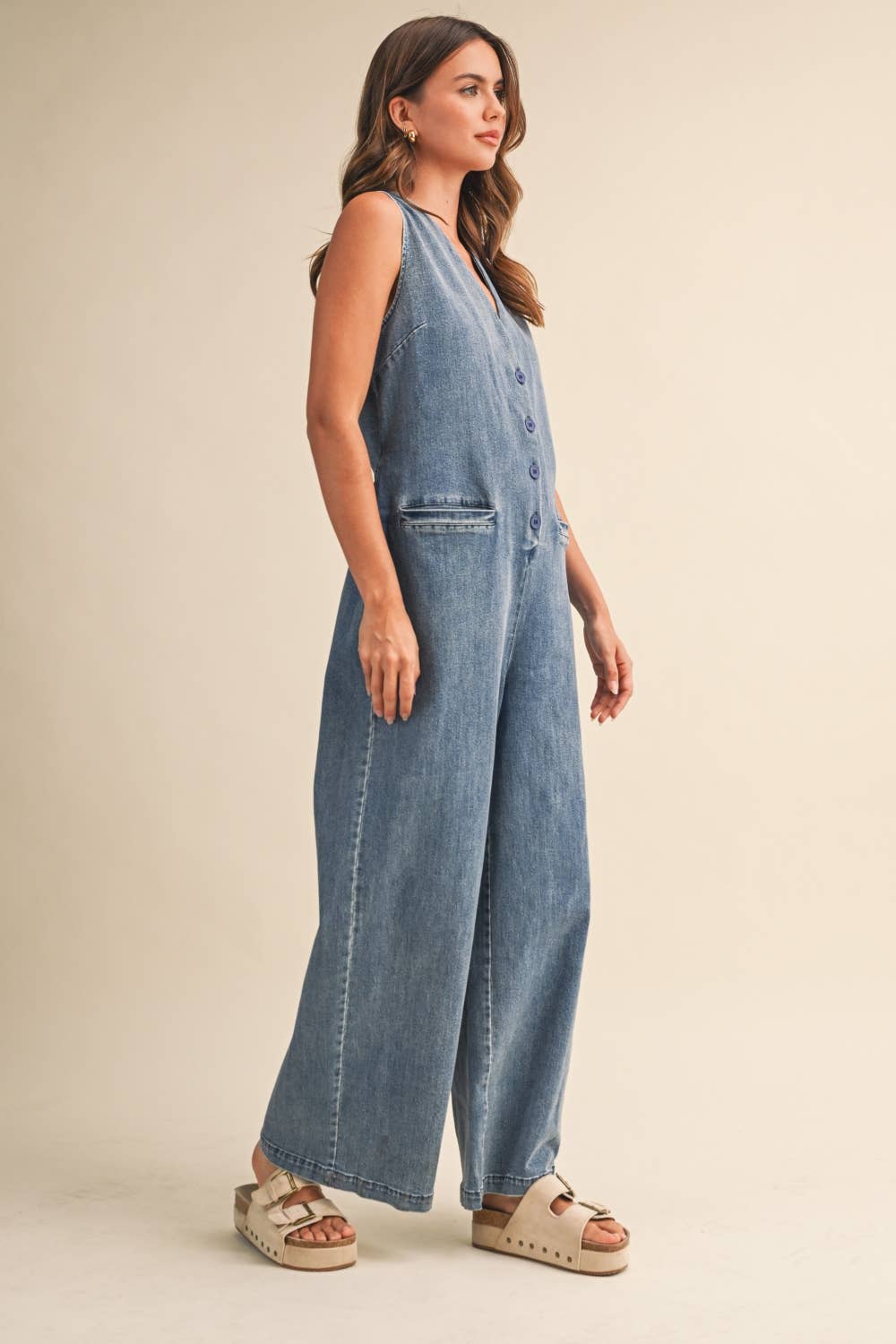 Denim sleeveless jumpsuit with adjustable back tie. Loose fitting and wide leg for a comfortable yet stylish outfit.