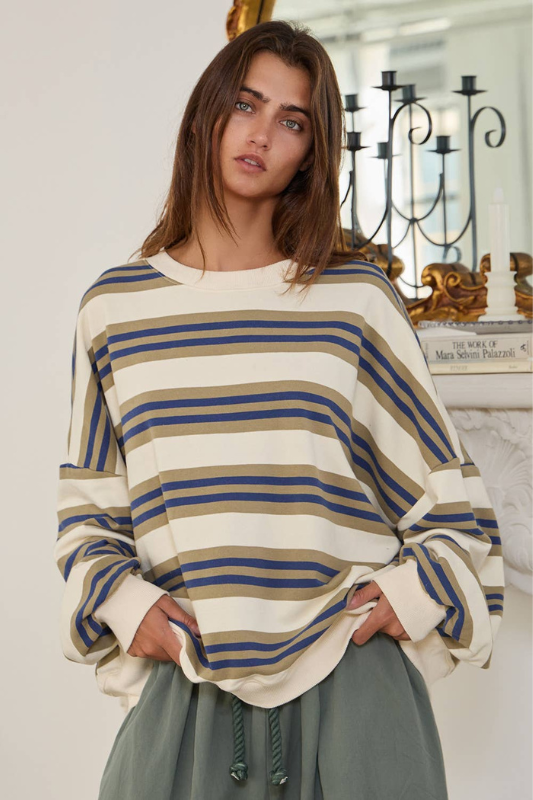 Striped Terry Oversized Sweatshirt Top - Crewneck - Slouchy shoulder - Long puff sleeves - Boxy fit! Super lightweight and easy to layer.
