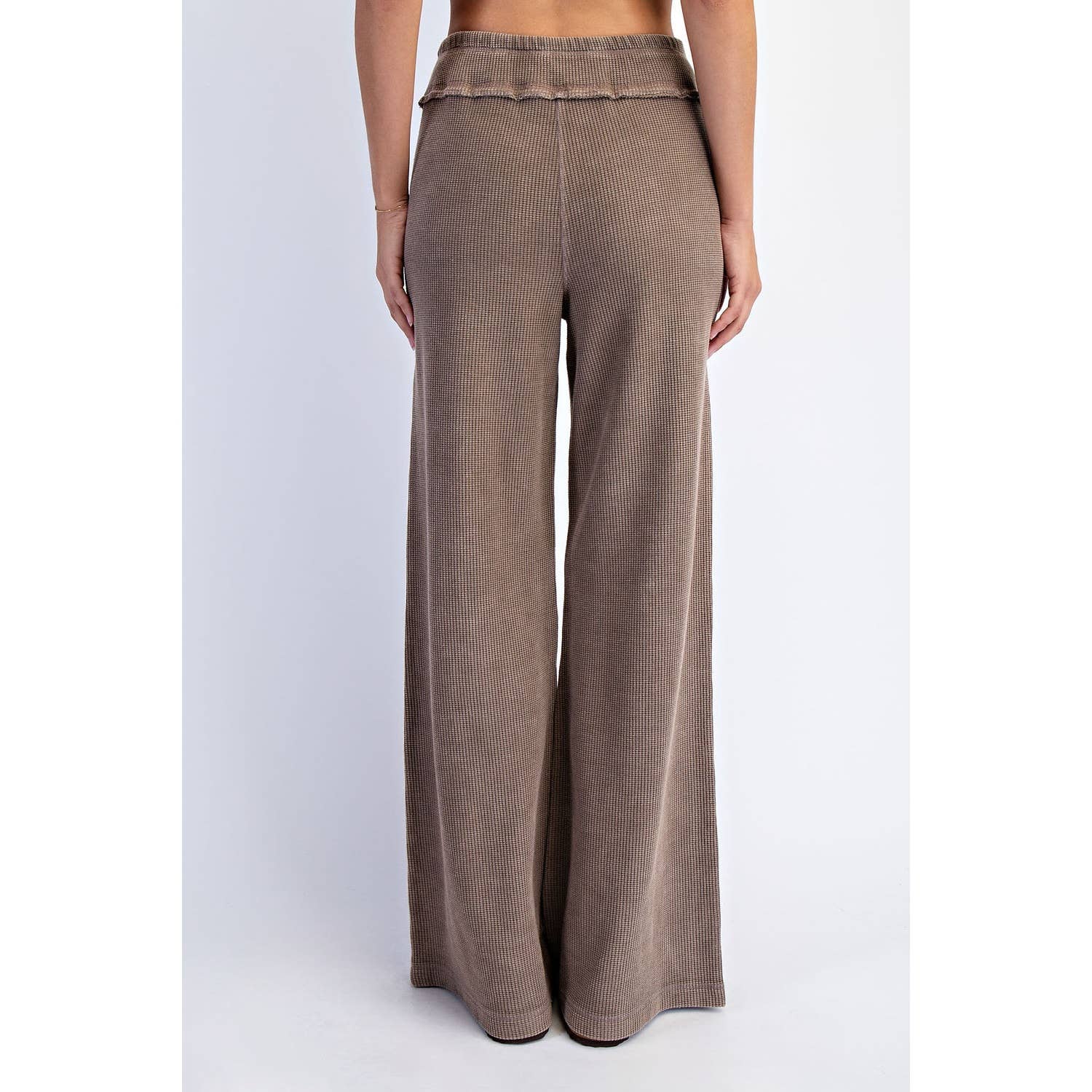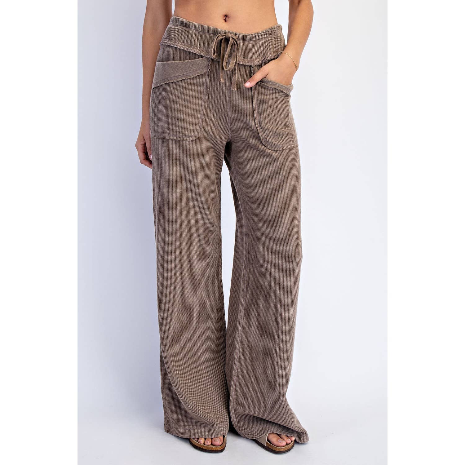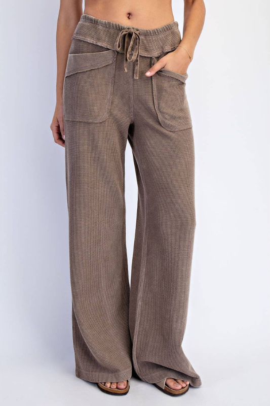 Relaxed and full of texture — these wide-leg pants are made from honeycomb fabric that's been mineral washed to enhance its dimensional weave. The result is a soft, lived-in feel with a beautifully vintage tone. Effortlessly flowy and full-length for an easy, laid-back silhouette. Features: - Mineral washed honeycomb fabric - Breathable and textured - Relaxed fit / Oversized - Full length - Mid-rise / Mid waist - Adjustable waistband - Raw edge details - Patched pockets detail