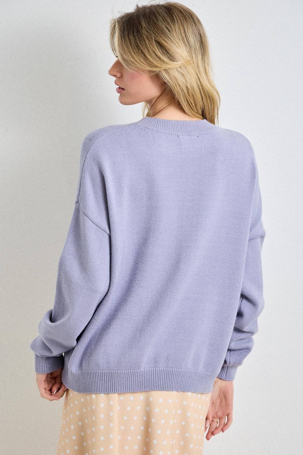 This delightful knit sweater features a whimsical and bold orca design knitted directly into the fabric, making it a unique statement piece. -A prominent, detailed orca motif centrally placed on the front. -body of the sweater is a lovely, muted shade of soft lavender/periwinkle blue. -a relaxed, slightly oversized fit with drop shoulders -a classic crew neckline and finished rib-knit cuffs and hem for a neat, snug fit where it matters